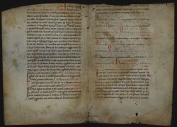 Las hojas reutilizadas de este códice pertenecen a un libro litúrgico (misal, breviario...) e incluyen fragmentos de los evangelios de Lucas (16, versículos 19-31: parábola del rico y el pobre Lázaro) y de Juan (3, versículos 1-15: conversación de Jesús y Nicodemo), además de cánticos con notación musical: "Ego dixi: Domine miserere mei..."