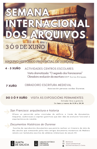 O día 9 de xuño celébrase o Día Internacional dos Arquivos. Ao longo da semana previa o Arquivo Histórico Provincial de Ourense organiza as seguintes actividades: