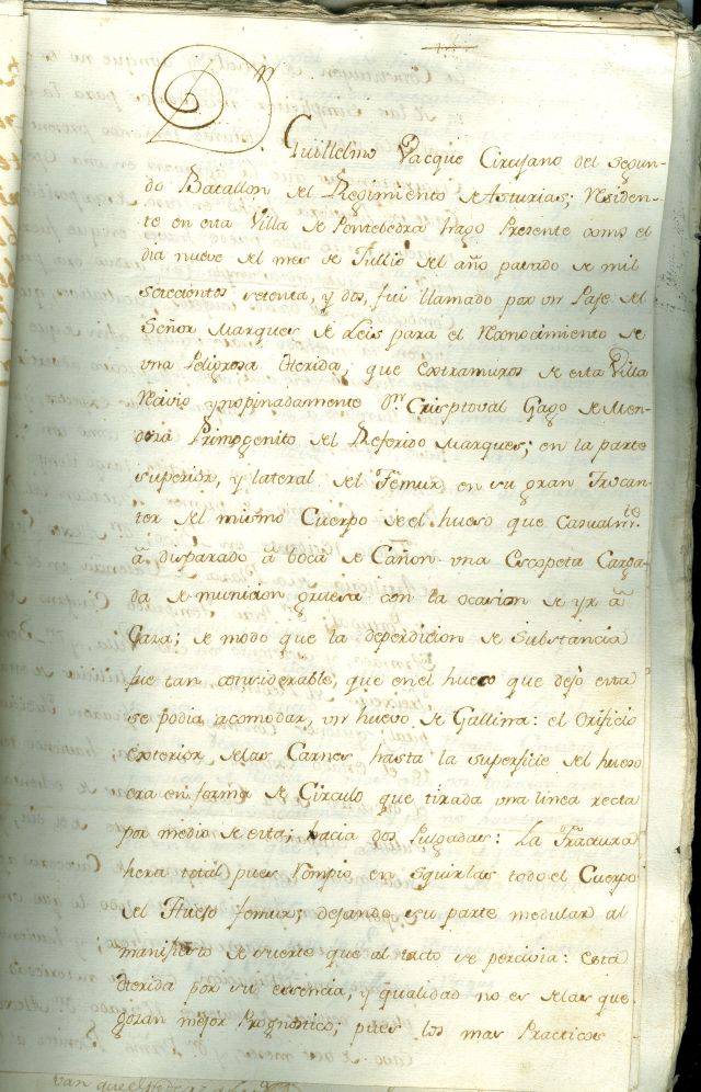 A ferida era moi grave, pois afectara á parte superior e lateral do fémur, “en su gran trocanter del mismo cuerpo del hueso... de modo que la desperdición de substancia fue tan considerable que en el hueco que dejó ésta se podía acomodar un huevo de galina... La fractura era total, pues rompió en squirlas todo el cuerpo del hueso fémur, dejando su parte medular al manifiesto, de suerte que al tacto se percivía. Esta herida, por su essencia y qualidad no es de las que gozan mejor prognóstico, pues los más prácticos la constituyen de lethal”. O cirurxán taponou e ligou o mellor que puido a ferida e mandou trasladar o ferido á casa do marqués, onde chegou “conduzido en una parbihuela y sobre de ésta un colchón doblado a lo largo, la que trahían seis soldados de dicho Regimiento de Asturias”. Pola gravidade da ferida, Vacque, denominado tamén “Monsieur Bacquier” (o que delata a súa orixe francesa), convocou no domicilio do marqués a outros cirurxáns militares de Pontevedra para que lle axudasen na curación “y en la noche de este día, a pedimento de dicho Marqués, padre del herido, quedó dicho don Guillermo y el que declara a dormir en dicho quartto donde se ha puesto al herido, por si le resultaba algún flujo de sangre para procurar contenerlo...” Así, “al día siguiente concurrió a la curazión don Pedro Temprado, Cirujano de Marina..., y don Benito Freixeiro, cirujano de Milizias de esta capital. Y en este día por la tarde concurrió también don Bartholomé Benites, cirujano del Regimiento de Toledo. Y entre ellos tratavan y consultaban sobre las operaziones y diltaciones que hallaban por precisas... Y de pasados algunos días tmbién concurrió don Alejos Baches, cirujano de Artillería de la plaza de Balencia, Reino de Portugal, como también quando legó el compañero de don Guillermo, también cirujano de dicho Regimiento, don Joseph, que ignora su apellido...” Tras sucesivas operacións e múltiples curas, realizadas ao longo de oito meses, obtívose a curación total, mais o marqués non quixo pagar ao cirurxián francés máis que 1.500 reais alegando que ninguén o chamara para atender o ferido senón que fora por vontade propia... No preito que se suscitou logo ante a Real Audiencia de Galicia, aquel solicitou a taxación do seu traballo por outros facultativos, que ditaminaron que se lle debían outros 2.500 reais por ese traballo e por ter asistido tamén á muller do ferido, dona Chathalina, “a unos tumores que de resulta de biruela le sobrevinieron en este tiempo”. O marqués presentou seis testemuñas ao seu favor, algúns dos cales, como o médico da vila, don Joseph Casal Señoráns, realizou unha colorida declaración na que, ademais de poñer en dúbida a profesionalidade do francés, asegurou que o peso da curación leváraa outro cirurxián, don Bartolomé Benítez. Nela narra a primeira visita que fixo ao enfermo, do que era amigo, e a xuntanza que tivo cos facultativos que o asistían e na que, segundo el, o Vacque non despegaría os beizos: “ “...y de pulsado y reconocido el enfermo, como tenía buenas noticias el que declara del Benites y haberle tratado y tenerle por el más ábil, le llamó y llevó para la guerta y enxido que tiene dicha casa del Marqués, y sentados allí devajo de los naranjos, a cuios sitios tanvién concurrieron el Temprado, Freixeiro y Bacquier, que unos se sentaron y otros estubieron de pie y en fuerza de lo que lleva dicho pidio le hiciese dicho Benites relación lo más breve que pudiese porque estimaba mucho la vida de dicho enfermo, en que hera ynteresado. “Executolo así dicho Benítez y atajándole el que declara le preguntó si estaban echas las ebacuaciones de sangre correspondientes de una y otra parte, porque éstas sin perder tiempo se devían satisfacer... Y a todo ésto con prudencia dicho Benítez satisfizo al que declara, sin que los otros despegasen los labios...” Pero os testemuños do demandante eran moito máis sólidos e, como alegou o seu procurador, el tiña o seu propio soldo e non tiña moito sentido que acudise durante oito meses a curar a un ferido sen que ninguén llo encargase. Así que a Audiencia o amparou e condenou ao marqués a pagar a débeda que contraera con el. En todo caso, o fillo do marqués curou, mais sen dúbida quedou coxo de por vida. Este preito ten a signatura 20249-39 do fondo da Real Audiencia de Galicia. Pode lerse unha transcrición más ampla no sitio web do Arquivo: http://arquivosdegalicia.xunta.gal/…/curacion_2019_01_13.pdf A fotografía é de Pontesampaio. Ten a signatura 4338 da Colección Fotográfica.