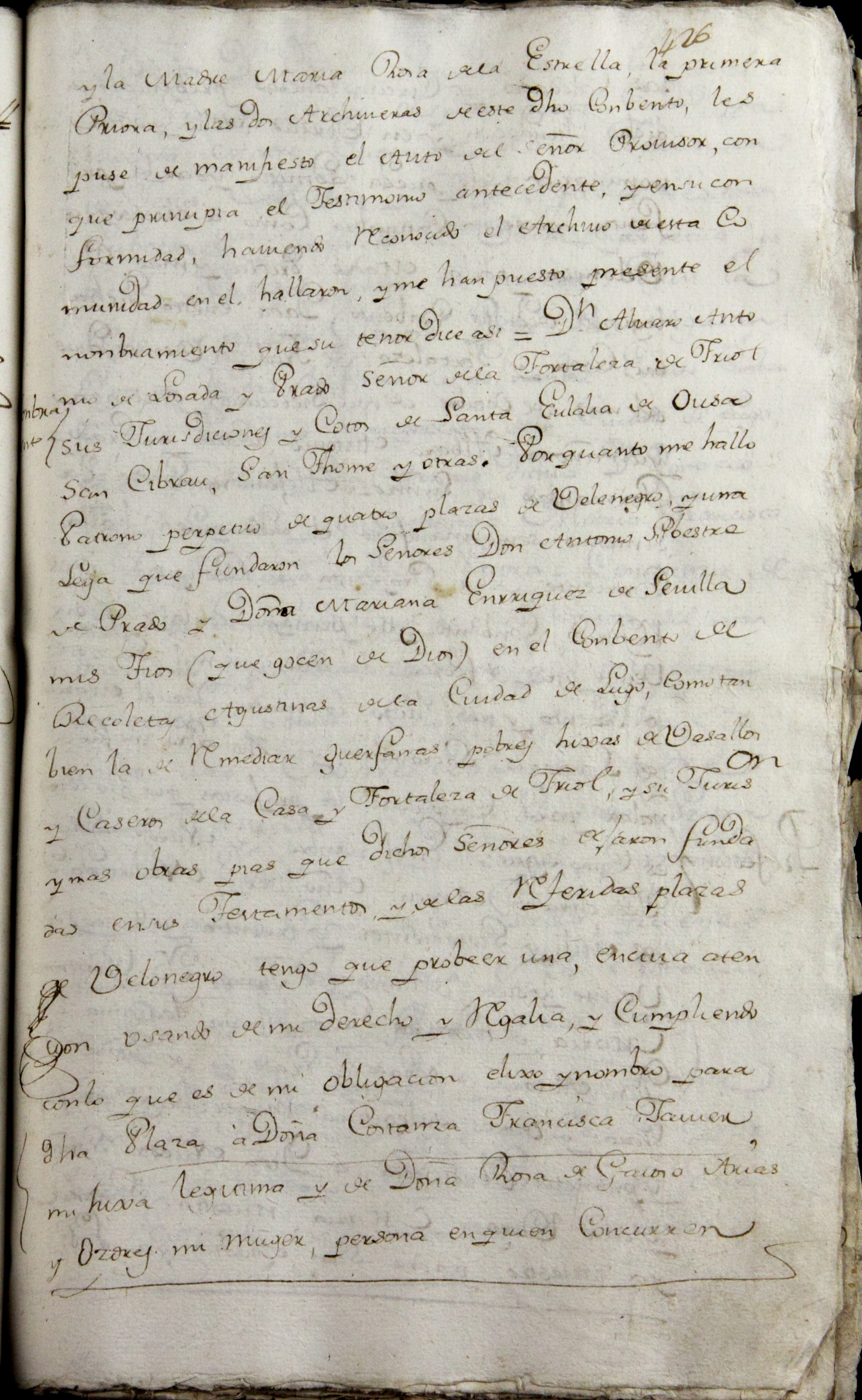 “Don Álvaro Antonio de Losada y Prado, señor de la Fortaleza de Friol, sus jurisdicciones y cotos de Santa Eulalia de Ousa, San Cibrán, San Thomé y otras, por quanto me hallo patrono perpetuo de quatro plazas de velenegro y una lega que fundaron los señores don Antonio Silvestre de Prado y doña Mariana Enríquez de Sevilla, mis tíos (que gocen de Dios) en el convento de recoletas agustinas de la ciudad de Lugo, como también la de remediar güérfanas pobres hixas de vasallos y caseros de la casa y fortaleza de Friol y su jurisdicción y más obras pías que dichos señores dejaron fundadas en sus testamentos y de las referidas plazas de velonegro tengo que probeer una, en cuia atención usando de mi derecho y regalía y cumpliendo con lo que es de mi obligación elixo y nombro para dicha plaza a doña Costanza Francisca Javier, mi hixa lexítima y de doña Rosa de Gaioso Arias y Ozores, mi muger, persona en quien concurren las calidades y circunstancias prebenidas en dicha Fundación, y en virtud de ella y esta nominación se le pueda admitir y dar la profesión que se acostumbra como a monxa de velonegro por la madre priora y más religiosas de dicho conbento...