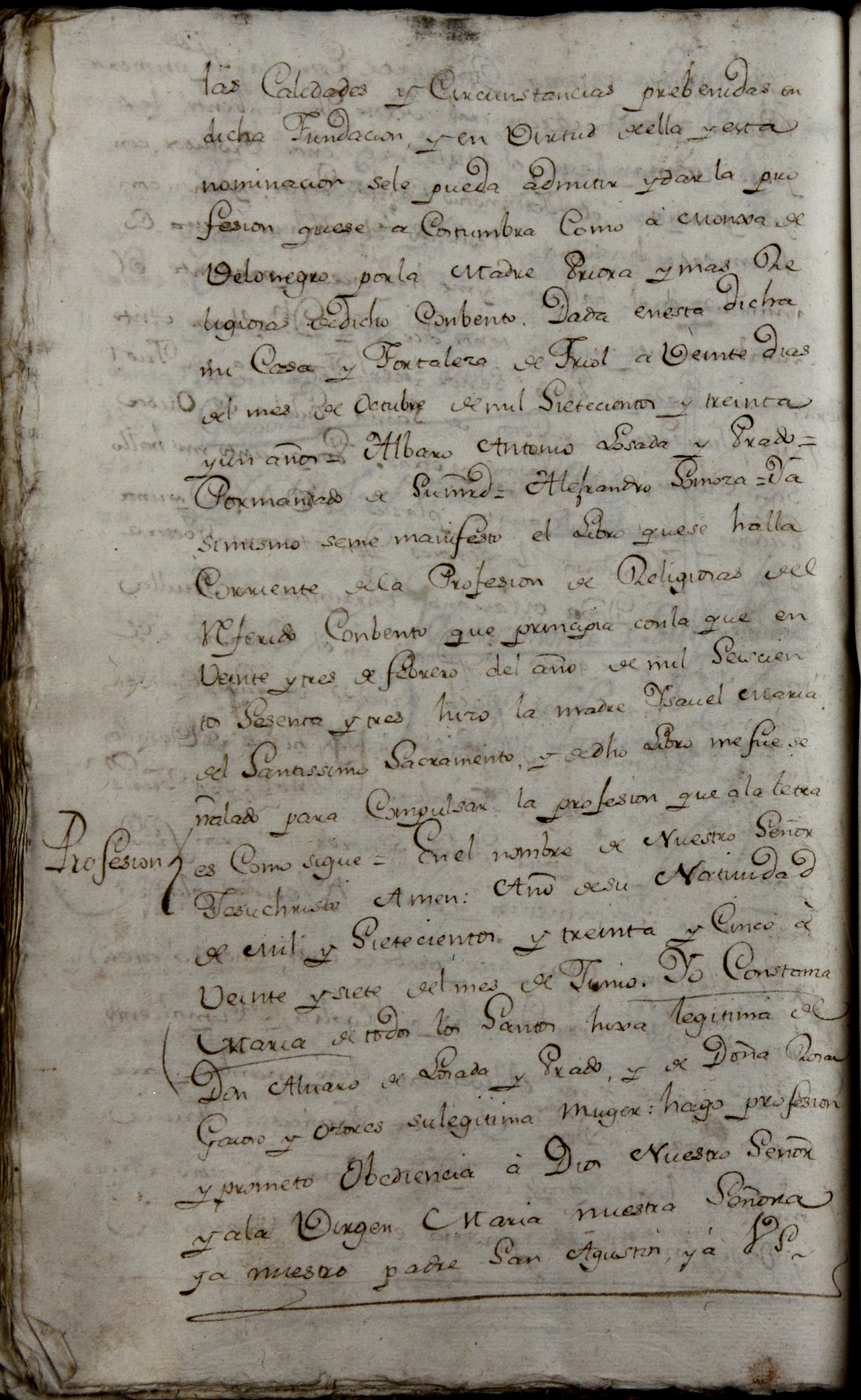 “En el nombre de Nuestro Señor Jesuchristo amén, año de su natividad de mil y sietecientos y treinta y cinco, a veinte y siete del mes de junio, yo, Constanza María de todos los Santos, hixa legítima de don Álvaro de Losada y Prado y de doña Rosa de Gaioso y Ozores, su legítima muger, hago profesión y prometo obediencia a Dios Nuestro Señor y a la Virgen María nuestra señora y a nuestro padre San Agustín y a vuestra señoría el señor don Ygnacio Saavedra en nombre de el señor Provisor de este obispado de esta ciudad, y a nuestra madre priora María Francisca de Jesús María y Joseph y a sus legítimos subcesores y prometo de vivir en perpetua pobreza y castidad hasta la muerte según la regla de nuestro glorioso padre San Agustín...”