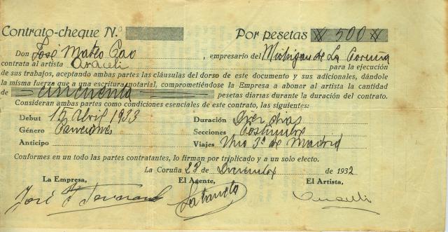 Presentou como proba o seu contrato (“cheque-contrato”). Un contrato leonino, por outra parte, que estipulaba que podería rescindirse “cuando el artista fuese rechazado por el público en tres actuaciones sucesivas”; que “abonará al agente intermediario y en concepto de comisión el 10 por 100 de su sueldo diario durante la duración del contrato, prolongaciones y renovaciones...que en caso de enfermedad del artista, éste no tendrá derecho a percibir sueldo alguno y si la enfermedad durara tres días, la Empresa podrá dar por rescindido este contrato”. No entanto, sinalaba que: