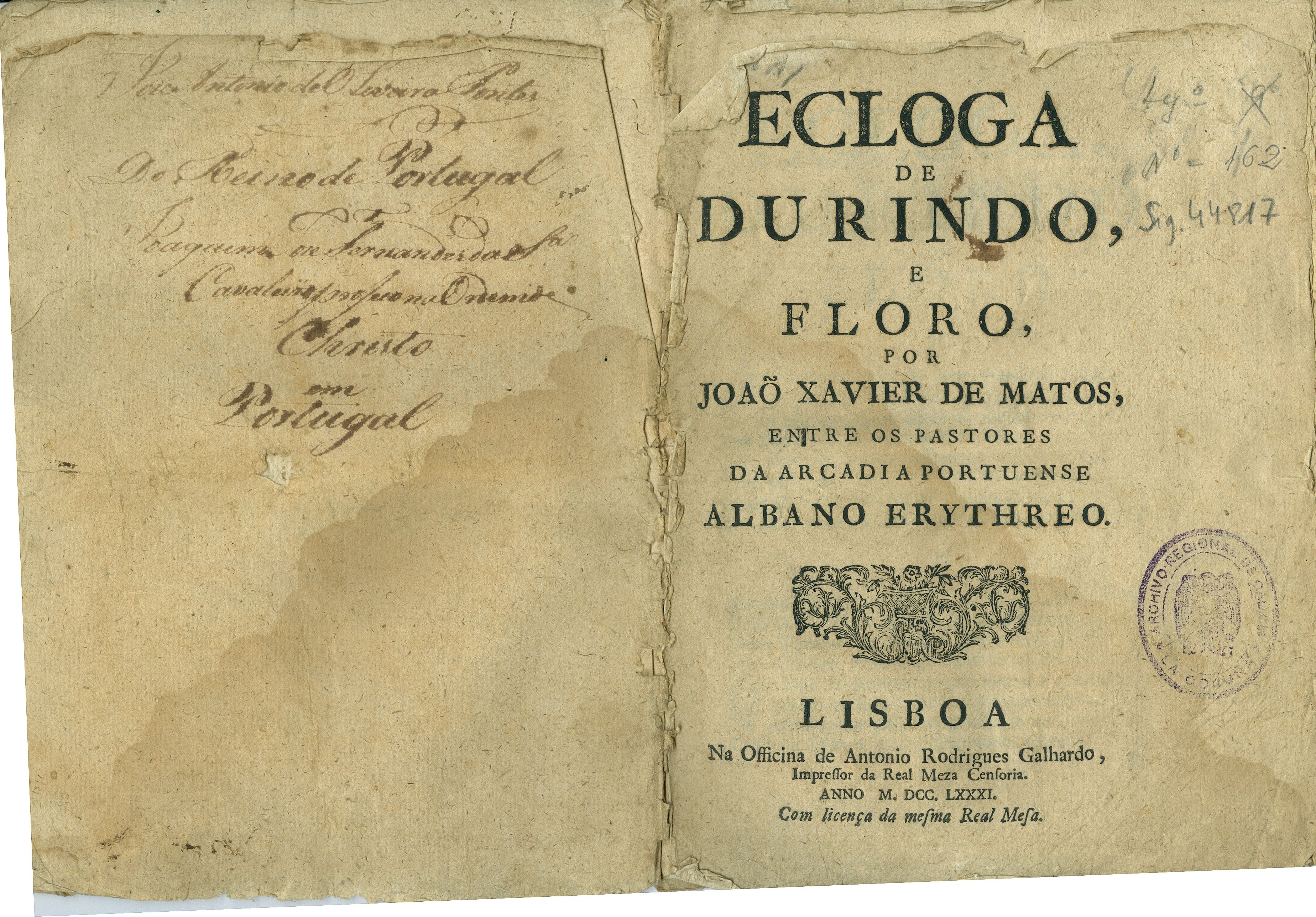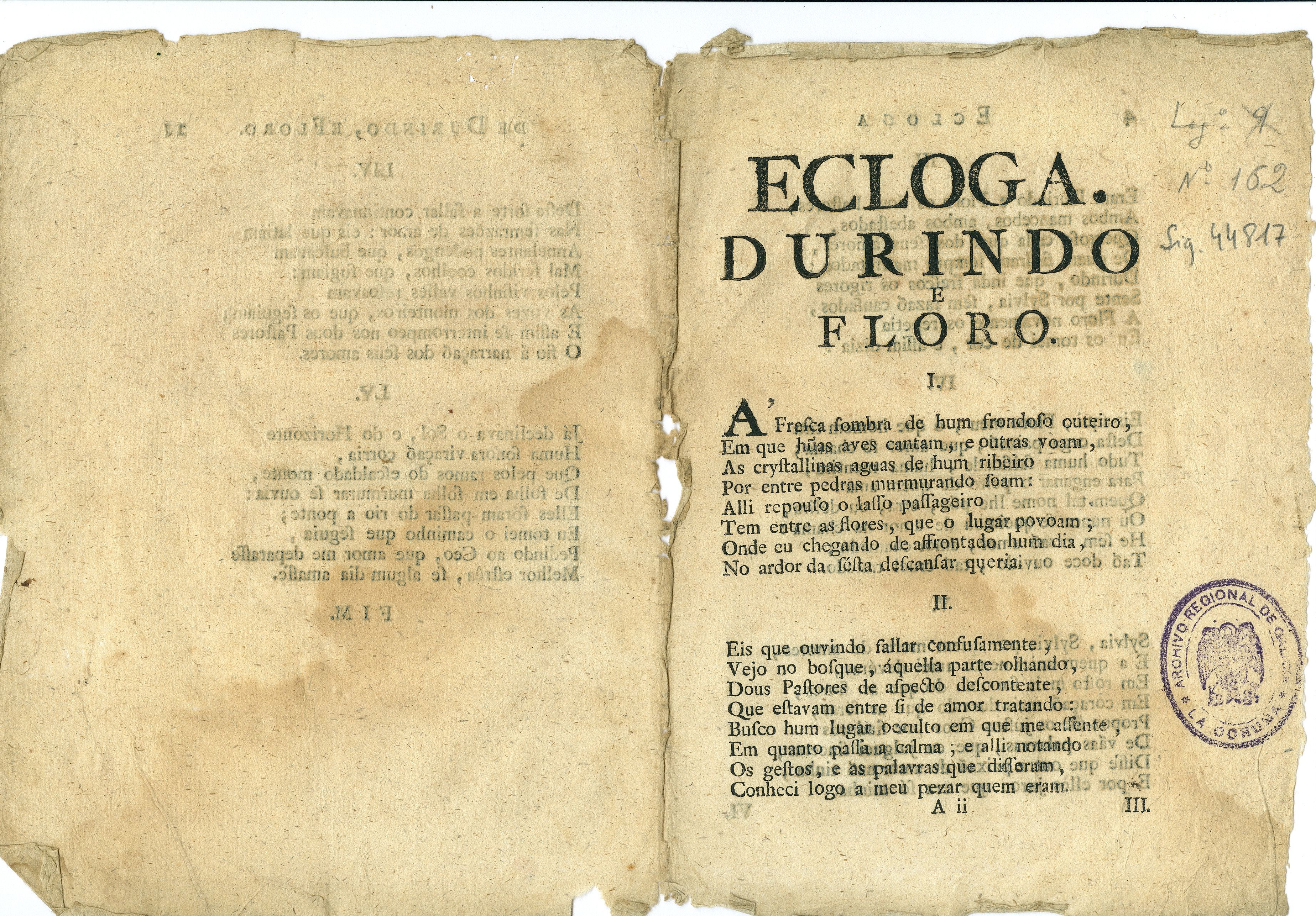 Celebramos a entrada da primavera e o Día Mundial da Poesía cun poema impreso en Lisboa no ano 1781, a "Ecloga de Durindo e Floro", escrita por João Xavier de Matos. Atópase no fondo documental do ilustrado coruñés José Cornide Saavedra.