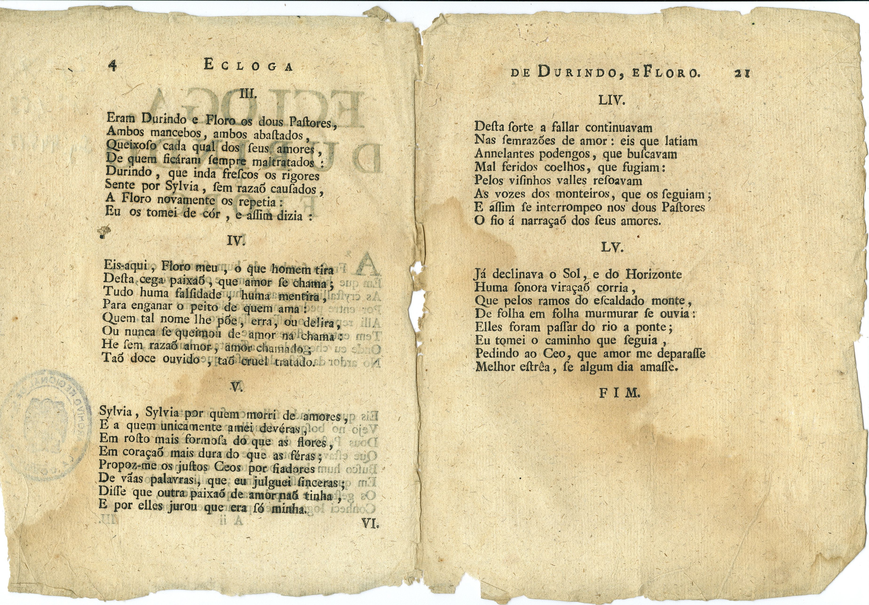 Narra os padecementos amorosos de dous pastores, Durindo e Floro, que falan das súas mágoas sen saberen que están a ser escoitados. O ton é pesimista (o amor adoita colleitar penas: "Eis-aqui, Floro meu, o que homen tira/Desta cega paixão, que amor se chama;/Tudo huma falsidade, huma mentira/para enganar o peito de quem ama" ), pero estes versos ofrecen sen dúbida un bo acubillo onde refuxiármonos doutras traxedias peores.