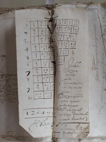 Velaquí un exemplo antigo de táboa de multiplicar. Atópase nun preito da Real Audiencia de Galicia de fins do século XVI e comezos do XVII e non parece que teña nada que ver co asunto de que fala este. Trátase dun papel dobrado e cosido no medio de dúas dilixencias do proceso do ano 1605. É probable que orixinalmente envolvese algún documento de proba achegado polas partes ao preito e que logo o oficial da escribanía que o coseu ao finalizar este non soubese interpretar o seu significado (que sería meramente utilitario) e o colocase ao revés. Pero isto é só unha suposición.